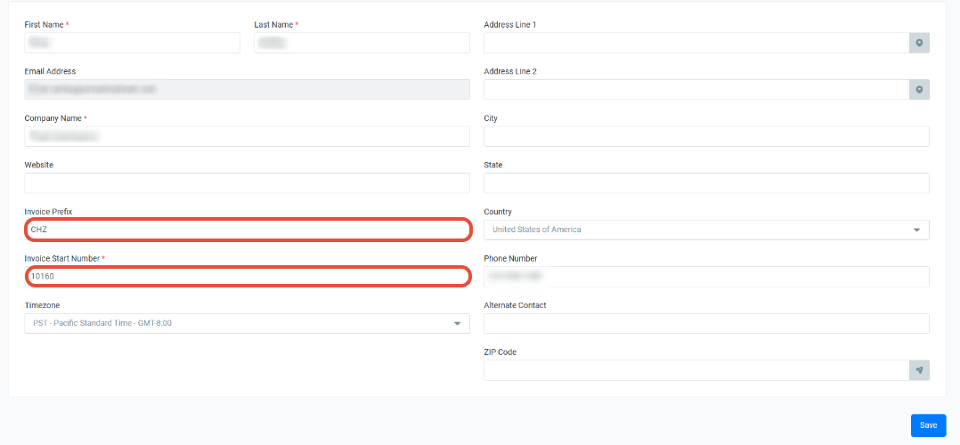 - While on the "General Settings" page, find the fields called "Invoice Prefix" and "Invoice Start Number." Make any changes here to customize your Invoice numbering.